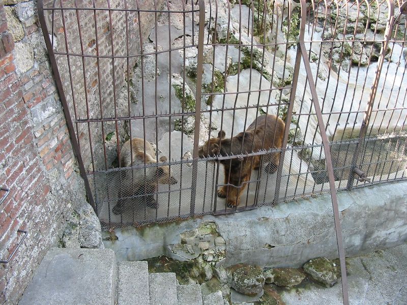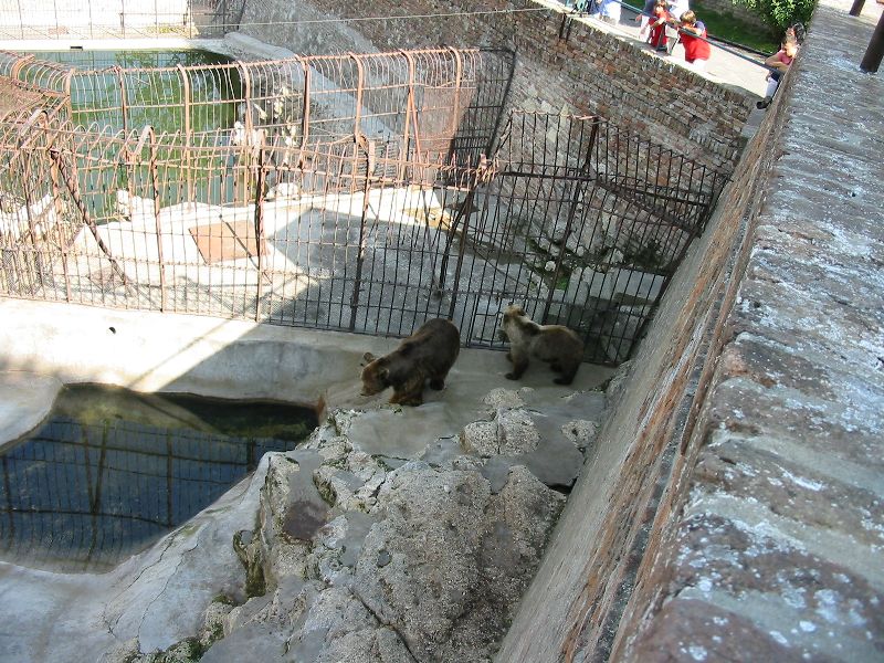 I don't know for sure, but I believe these are Masha and Misha, the bears that ate that guy two weekends ago. If you missed the story, there's an annual beer fest in Belgrade. This year a drunk guy descended from the cafe (barely outside the zoo grounds but overlooking this area), entered the bear cage, stripped down nude, and was eaten. This cage isn't directly under the cafe, but it has an open roof, so this has to be the one.