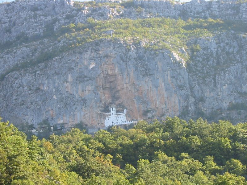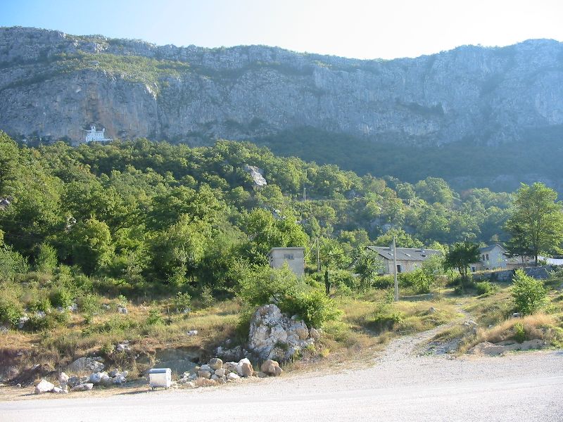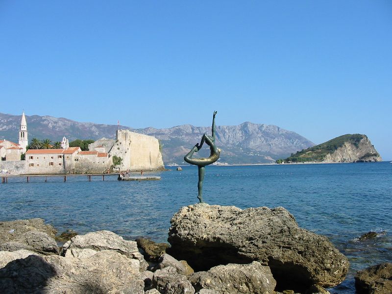 The minibuses arrived (with our bags, which we'd left at reception to make things easy) and took us back down to the other side of the valley to the bus stop (just an apparently unsigned trash-strewn island where two roads met). On the way down, Buz reportedly saw a car with a New Jersey license plate. We took a 3-hour bus ride to Budva, the "Montenegrin Miami". Along the way we made several stops in what looked like a decent-sized city. I thought it was the capital Podgorica (aka Titograd) but Gorana said it was Cetinje.