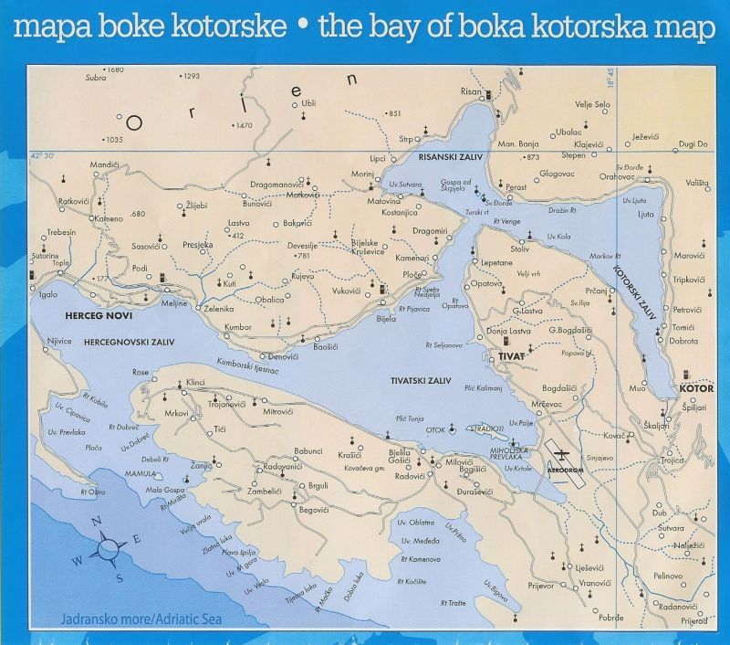 Here's a scan of the map we were given on the boat. Starting point Tivat is right of center; Herceg Novi on the left; Zanjic and Plava Spilja out toward the sea; Gospa od Skrpjela north of Tivat in that more-secluded bay (under where it says Risanski Zaliv); and Kotor is on the far right.