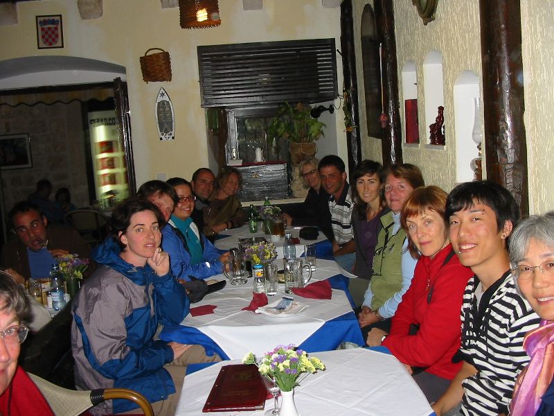 As this was the final night of the tour and I needed to get a buzz on (no offense to Buz), I went to a bar called fresh*, which I read about on the Web. It's known for cheap beers and the New York Times recommended it. So did Lonely Planet according to the sign outside, in a newer edition than mine apparently. I didn't like the atmosphere here--too artsy, and they were showing some Argentine film that all the patrons were sitting and watching with what seemed to be genuine interest. But the beers are cheap, at least for Croatia. The main draw here is the 3-litre beers--I saw the giant glasses hanging on the wall, but doubted if I'd be having one at all tonight. I started off instead with a Beck's. This was at 6:45pm. I noticed that happy hour (2 for 1) was starting at 7. It would be wrong not to take advantage. So I quickly finished that beer and ordered two more right at 7pm. But the 2-for-1 deal didn't cover Beck's--only 1/2 litres of draught beer. Surprising myself, I sucked down all 1.33 L in 40 minutes, and left at 7:25pm to meet the group, ready for action.