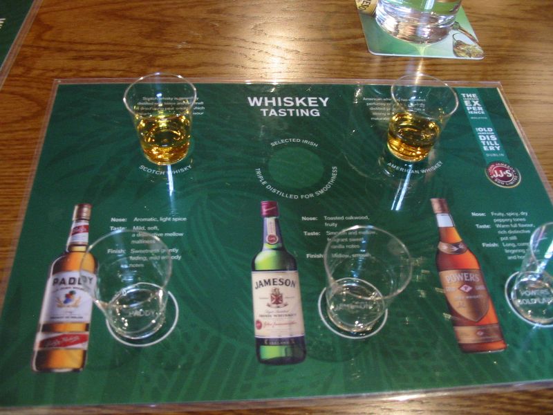 First we tasted the three Irish whiskeys at the bottom and had to pick our favorite. But they're all produced by Jameson, so there was no wrong answer. Then we compared our favorite to a sample of Scotch (Johnnie Walker) and American (Jack Daniel's). Had to go with Jameson. In comparison, I found JD harsh yet bland (it's aged in new oak barrels, whereas Irish whiskey is aged in barrels from places like Spain previously used for bourbon etc., so more flavor is absorbed) and JW too smoky (because they roast the barley over peat--ah, the peat--it's Ireland that's known for its peat, but the Johnnie Walker distillery is right on the border). Maybe I should have had the Scotch with plenty of ice. They informed us that American whiskey is distilled once, Scotch twice, and Irish thrice. I got a whiskey-tasting certificate for my efforts. I think I was the only one who downed all his samples after the tasting.