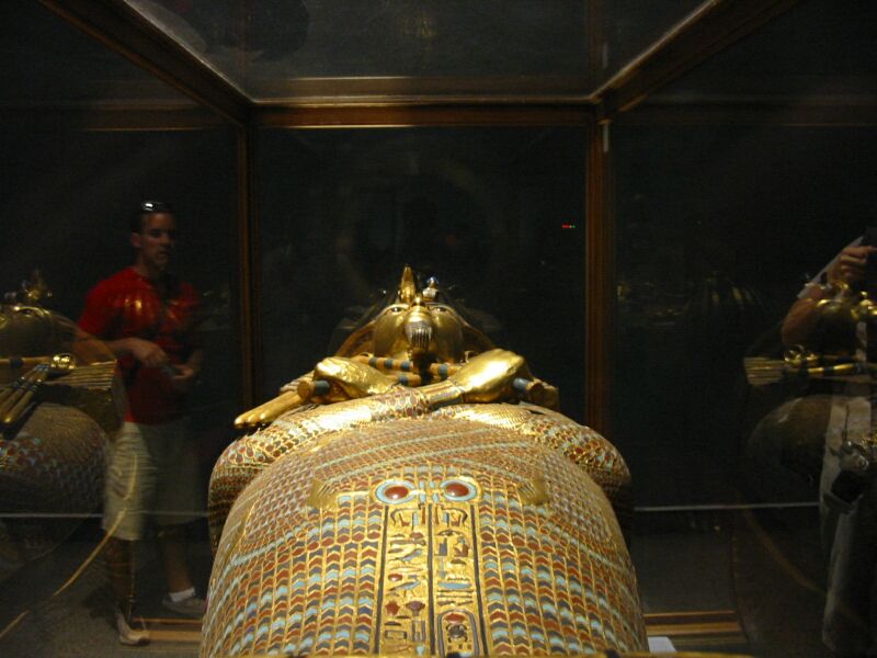 One of Tutankhamun's gold coffins. Tut's boyish good looks have evidently mesmerized Hayley from our group. When his tomb (visited May 29) was discovered it contained 4 nested gilded wood boxes, inside the innermost of which was the stone sarcophagus, inside which were 3 nested gold coffins, the innermost of which was made of 110 kg of gold and which contained the mummy. Several of the giant boxes are on display in the hallway outside this room. I believe the innermost coffin is the one still in the tomb.