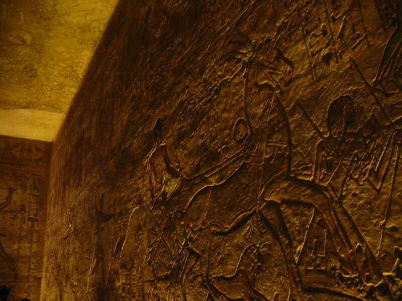 Early in the morning we flew an hour to Abu Simbel to see the Great Temple of Abu Simbel, built by Ramses II. Interesting flight in that the cockpit door flew open near the end of the flight and those of us seated on the aisle got a nice view of the landing. Most of the images in and on the temple depict Ramses II. All four colossi in the front are Ramses II. The temple and the one beside it were originally carved into the bluff below this point, but when threatened by the rising waters of the new Lake Nasser they were cut apart and moved to higher ground over a period of 8 years in the 1960s. Colossus #2 collapsed in an earthquake in 27 AD and was left in the same position after the move. Next 8 photos are from Abu Simbel: