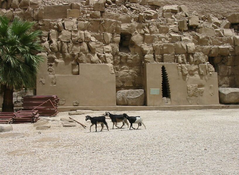 In the afternoon we took a camel ride through the back streets of Luxor. My camel's name was Casanova. About a third of the camels were named Casanova. My camel's boy was named Mohammed (~13 yrs). The neighborhood was full of goats, donkeys and tots saying "hello", cutely practicing their English. Mohammed claimed that his boss can't afford to pay him anymore because of the downturn in tourism, so he has to live off baksheesh. Dave had recommended no more than L.E.5, and I offered that to Mohammed, but he said it was "very small" and most tourists give 10-20. I was gonna give him 10 because he actually did a great job pointing out sights along the way, but his insolence cost him. I gave him 8.