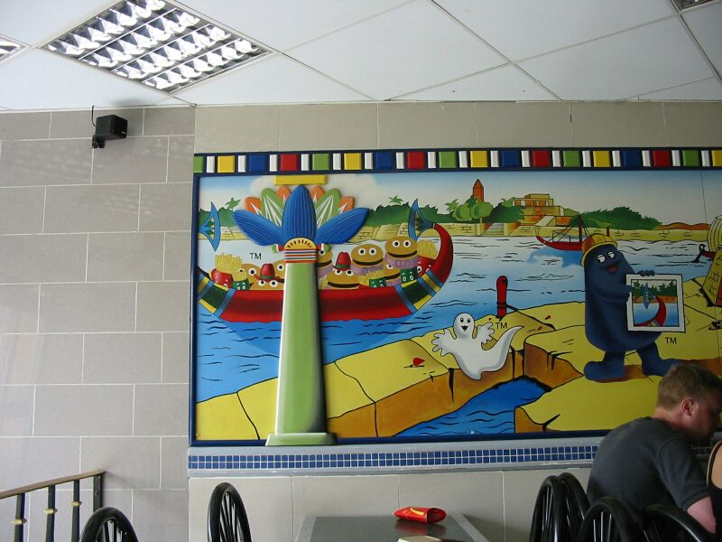 Part of a mural at the McDonalds in Luxor. Look in the boat and you'll spot the Fry Guys, not seen in US ads since the '80s. The entire mural depicts all the characters in a Luxor setting. What are those red drops? Why did McDonalds trademark a generic ghost? Why does serial sex offender Grimace appear to be in charge? Egyptologists continue to search for clues.