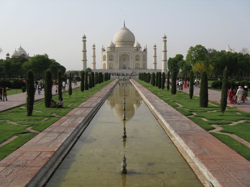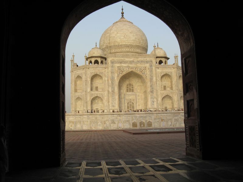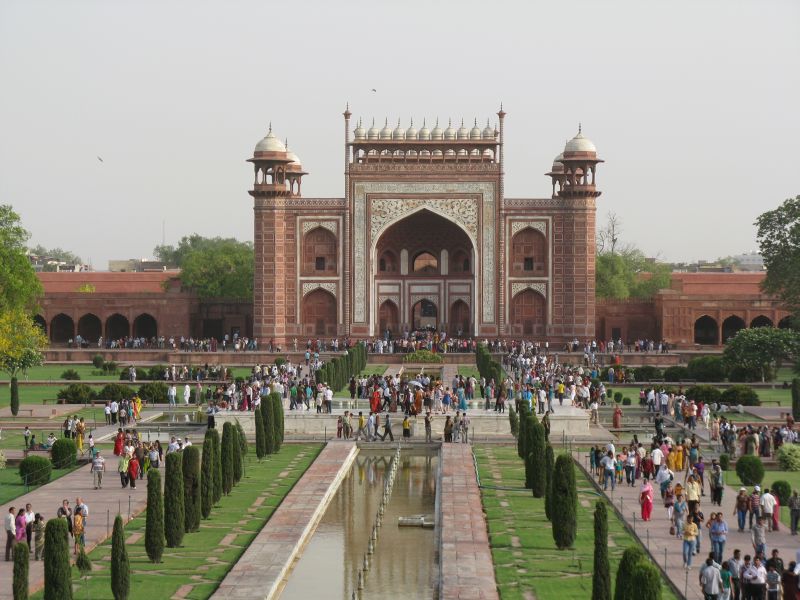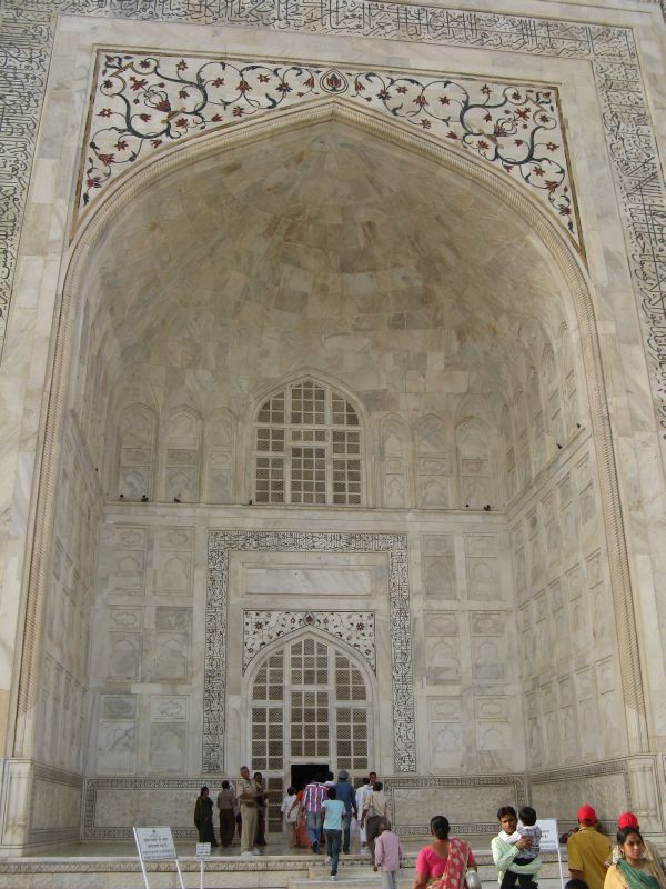 Outside the gateway to the Taj, which is visible through the bottom center arch.
